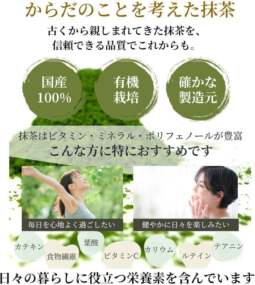 هذا المنتج معتمد عضويًا من وزارة الزراعة والغابات ومصايد الأسماك اليابانية (JAS) ويخضع لرقابة صارمة للغاية. يُعادل شاي الماتشا الياباني (USDA) وشاي أوراق الشجر الأوروبية. إنه شاي ماتشا عضوي مصنوع من الشاي الياباني الآمن. يتميز بطعمه الرائع وفوائده الصحية، لذا يُنصح به لمن يرغبون في اتباع عادات صحية للعناية بأجسامهم.